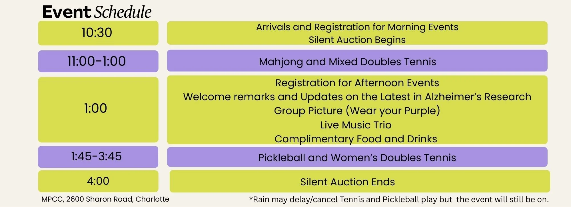 Brittany and Katie are proud members of the Charlotte community, working women, great friends and avid tennis players whose families have been devastated by dementia. This is our fifth year hosting the MPCC Alzheimer’s Tennis Fundraiser-a cause that is so close to our hearts.