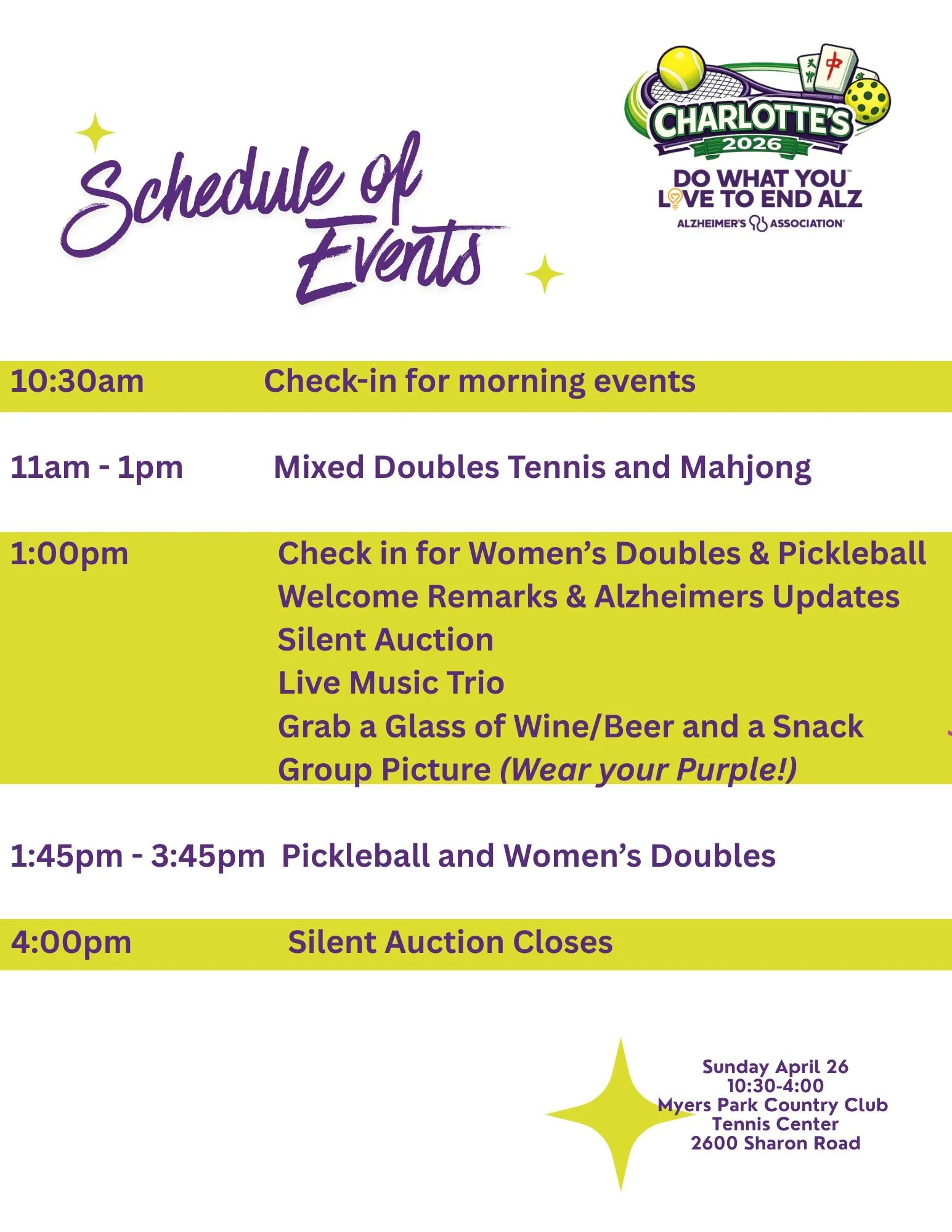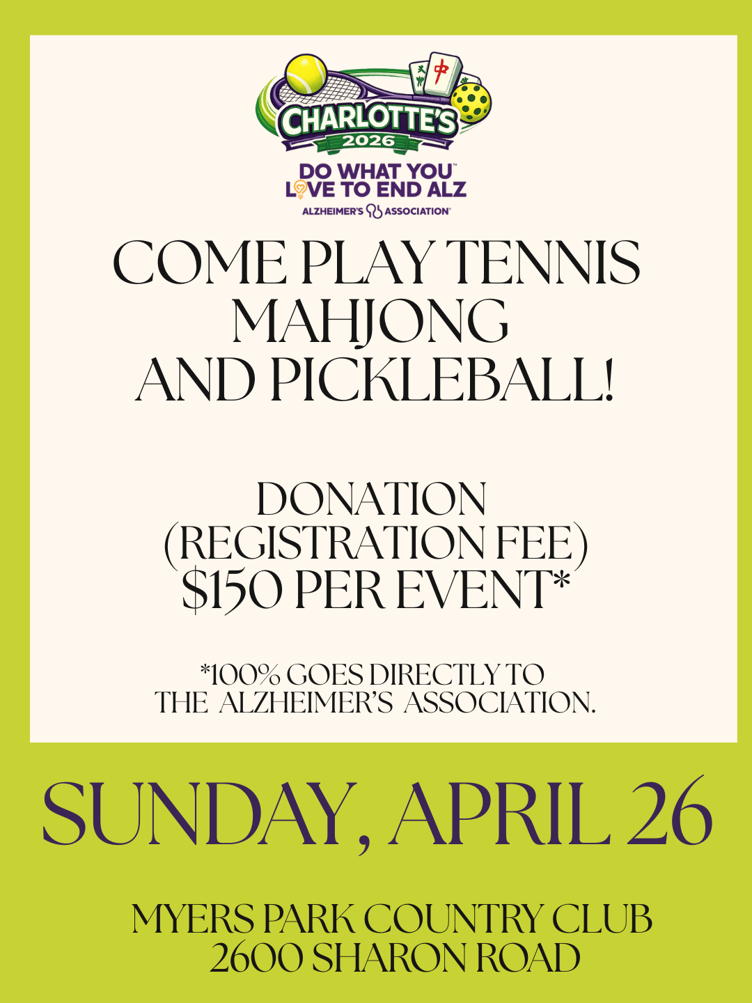 *Rain may cancel Pickleball and Tennis but Mahj and the event will still take place.